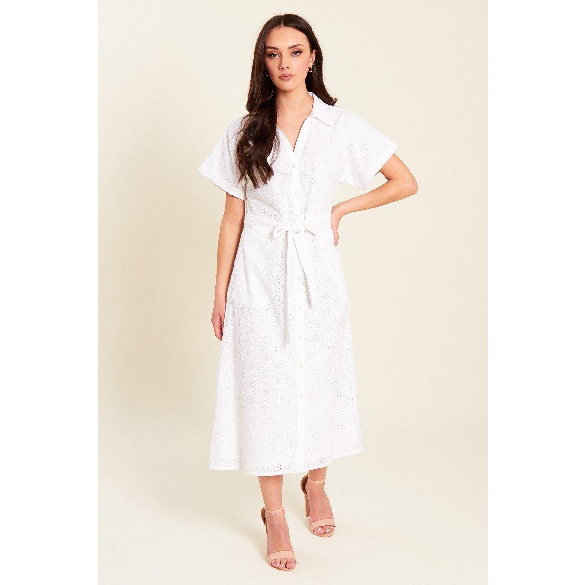 Das Broderie Tie Waist Midi Shirt Dress von Be You verfügt über bestickte Details und eine schmeichelhafte Form. Der taillierende Knoten und die Midi-Länge schaffen ein feminines Profil für den Stil von Tag zu Abend.