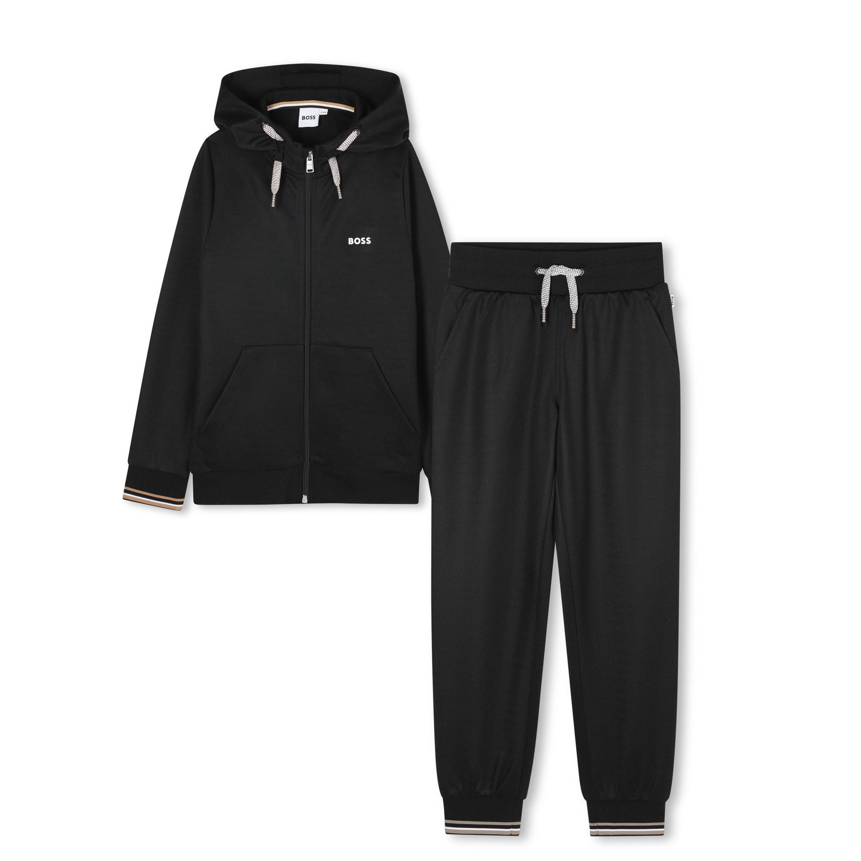 BOSS Kinder Full-Zip Trainingsanzug Jogginghose bietet täglichen Komfort und Stil. Das koordinierte Hoodie- und Jogginghosen-Set verfügt über gerippte Bündchen mit Streifendetails und einen verstellbaren Bund, der einen eleganten Look schafft, der sowohl Praktikabilität als auch BOSS-Stil bietet.