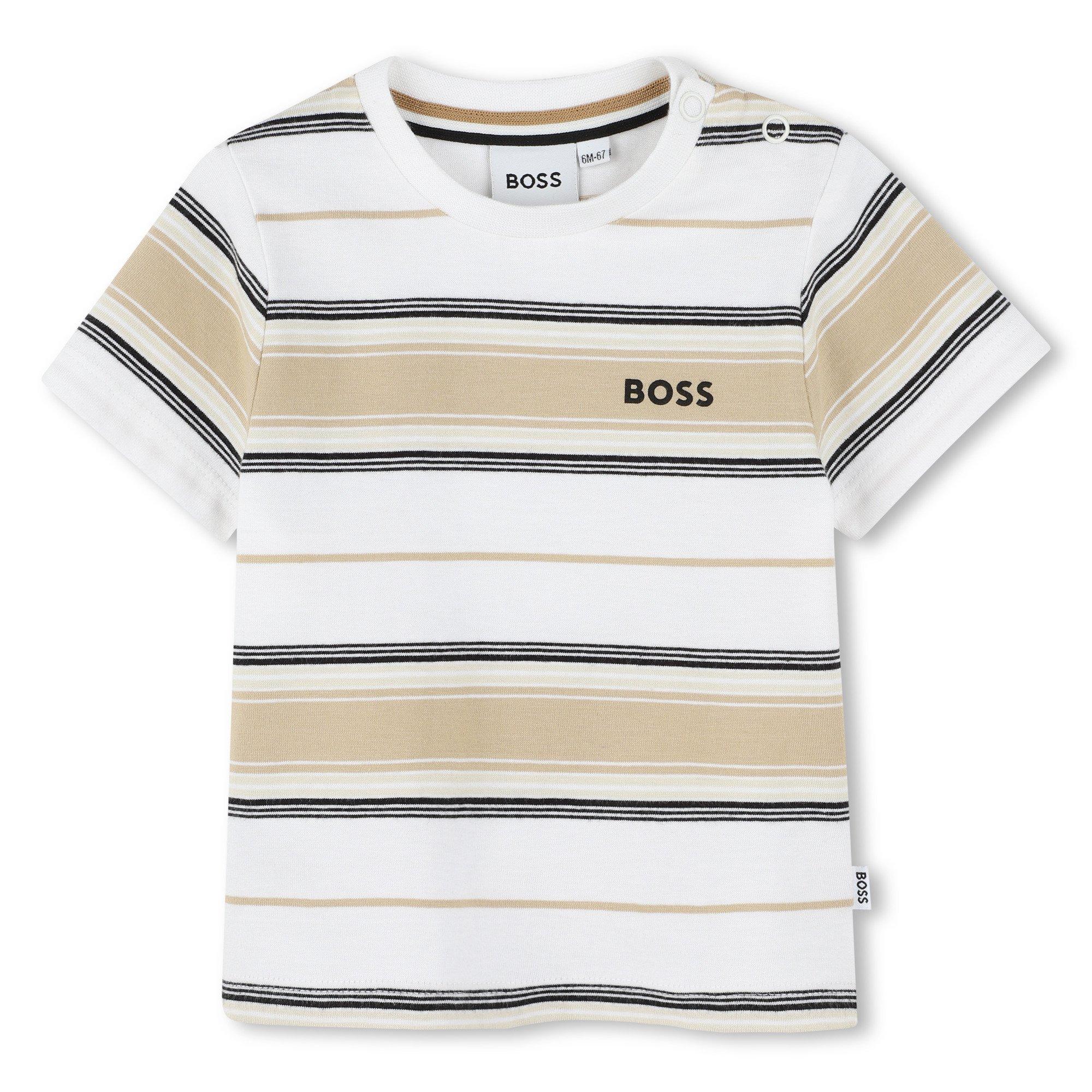 Das BOSS Kids' Streifen-T-Shirt bringt einen klassischen Look in die Alltagskleidung mit seinem klassischen Streifenmuster. Es ist in einer regulären Passform geschnitten und ermöglicht uneingeschränkte Bewegungsfreiheit an aktiven Tagen.