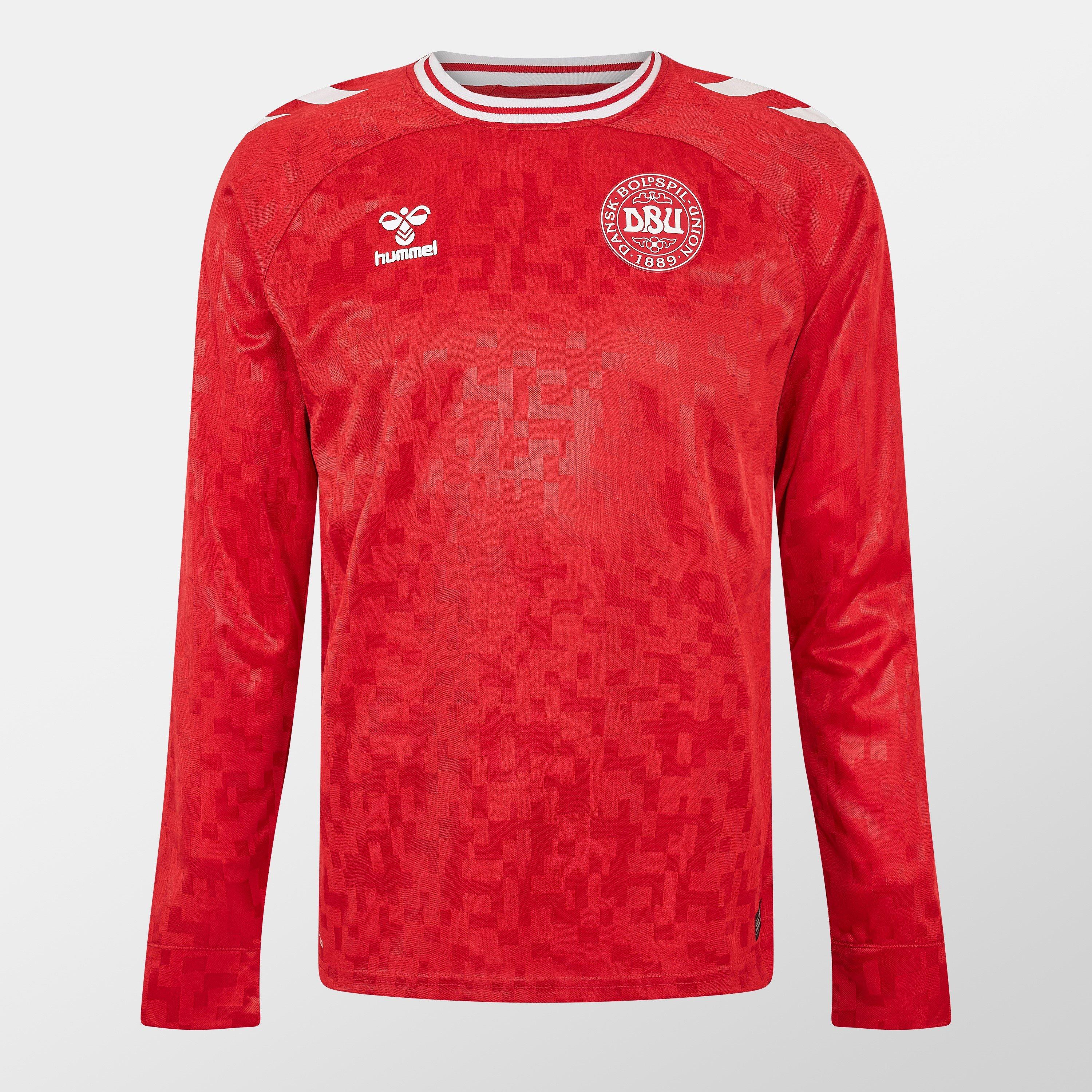 Das Dänemark Heim Langarm-Fußballtrikot von Hummel vermittelt authentischen Nationalstolz mit technischer Leistung für Unterstützer an Spieltagen und darüber hinaus und ist eine großartige Wahl für Fußballbegeisterte, die ein Fußballtrikot möchten.