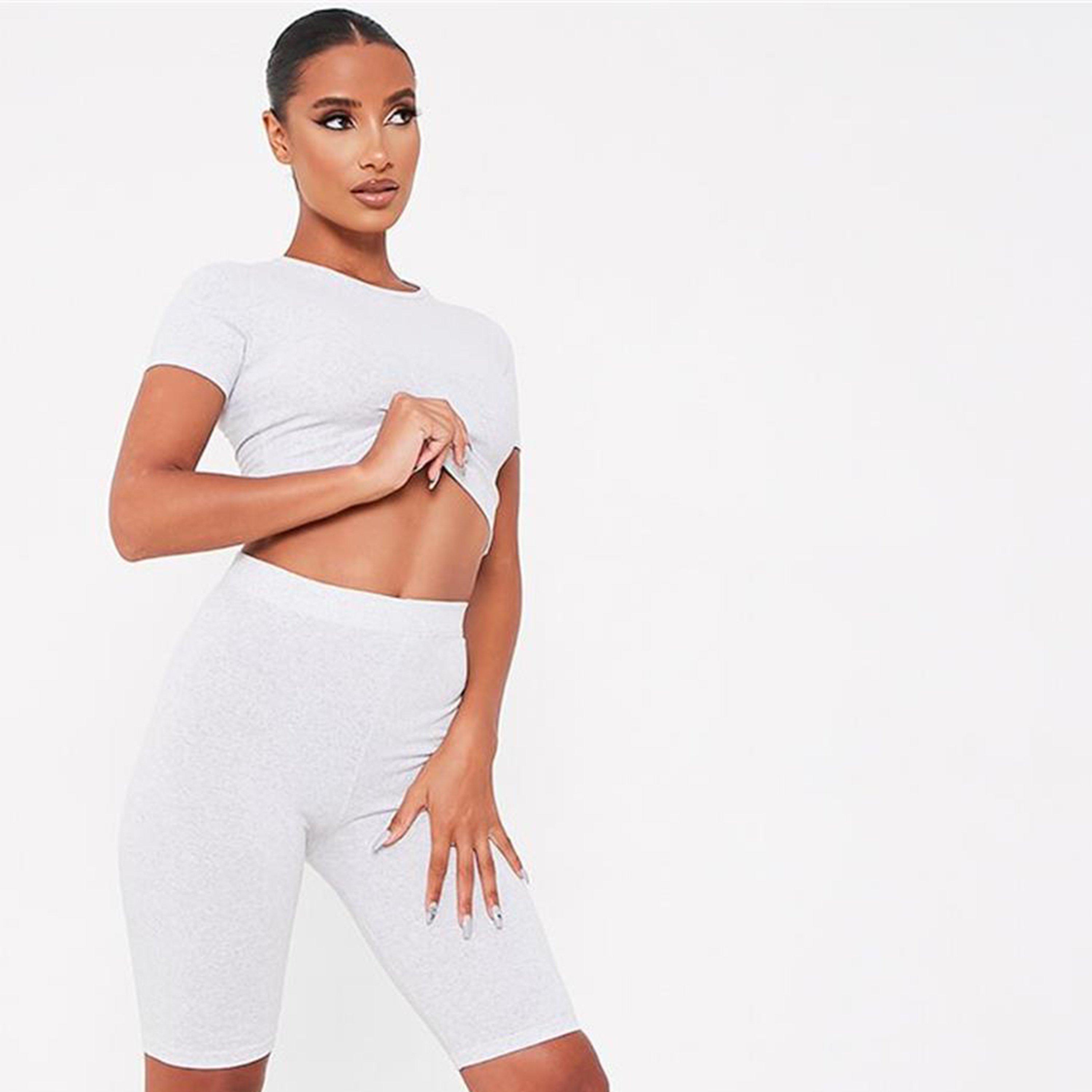 Koordiniertes Set bestehend aus einem kurzärmeligen Crop-Top und hoch taillierten Radlerhosen.