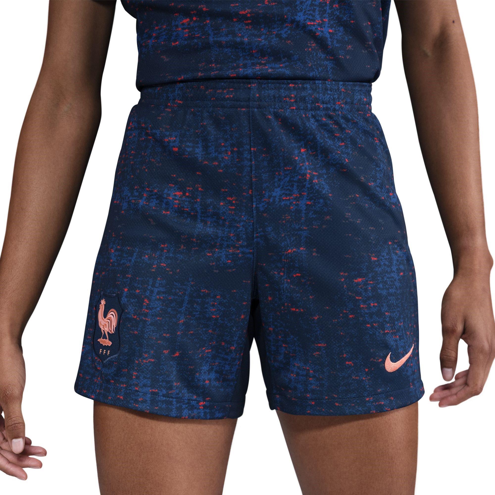Zeigen Sie Ihren Stil mit den Nike Frankreich Heimshorts 2025. Sie bieten eine reguläre Passform für ganztägigen Komfort und sind in einer kräftigen einfarbigen Farbgebung mit einem auffälligen roten Muster erhältlich. Abgerundet mit dem ikonischen Frankreich-Wappen sind sie perfekt für Trainingseinheiten, Spieltage oder um Les Bleus von den Tribünen aus anzufeuern.