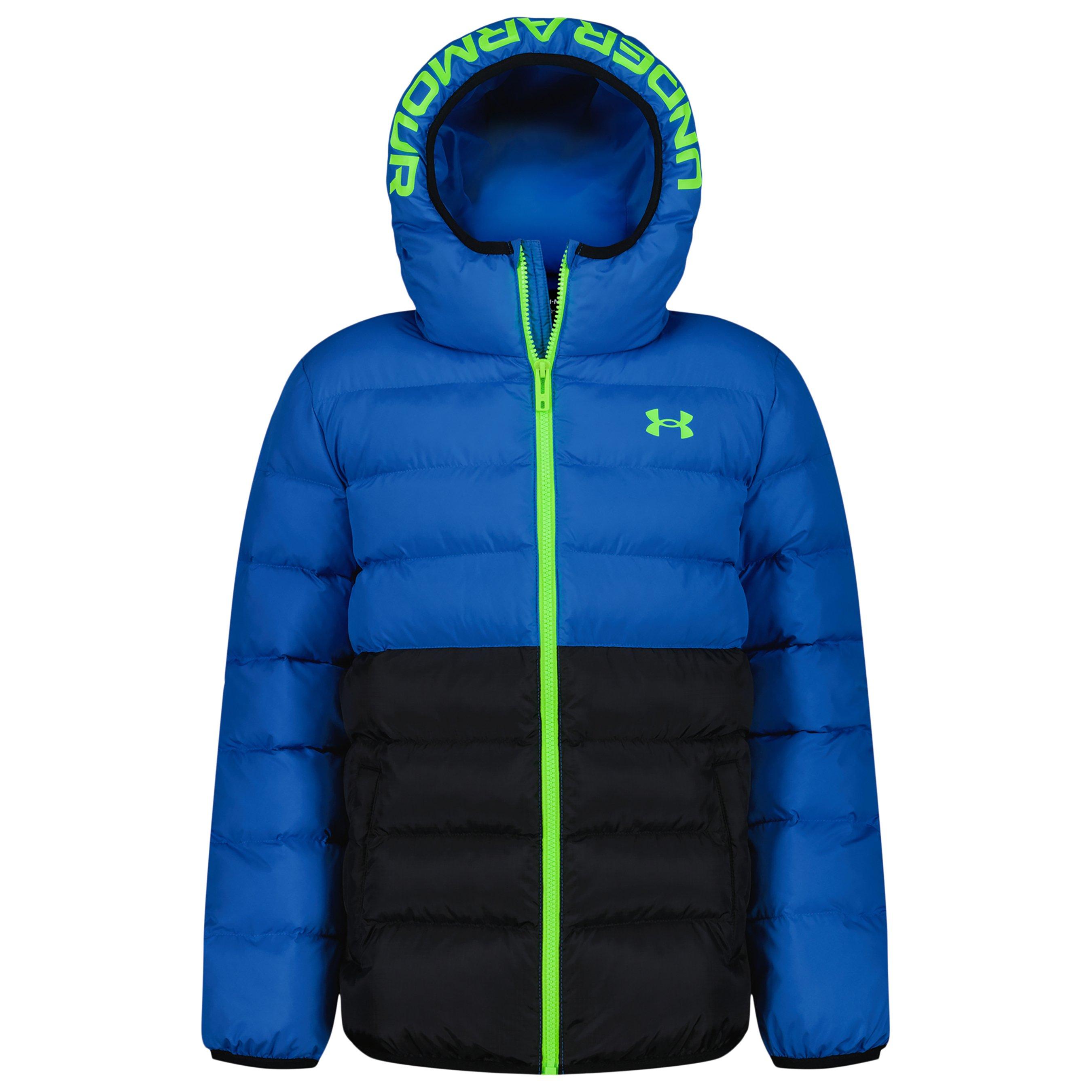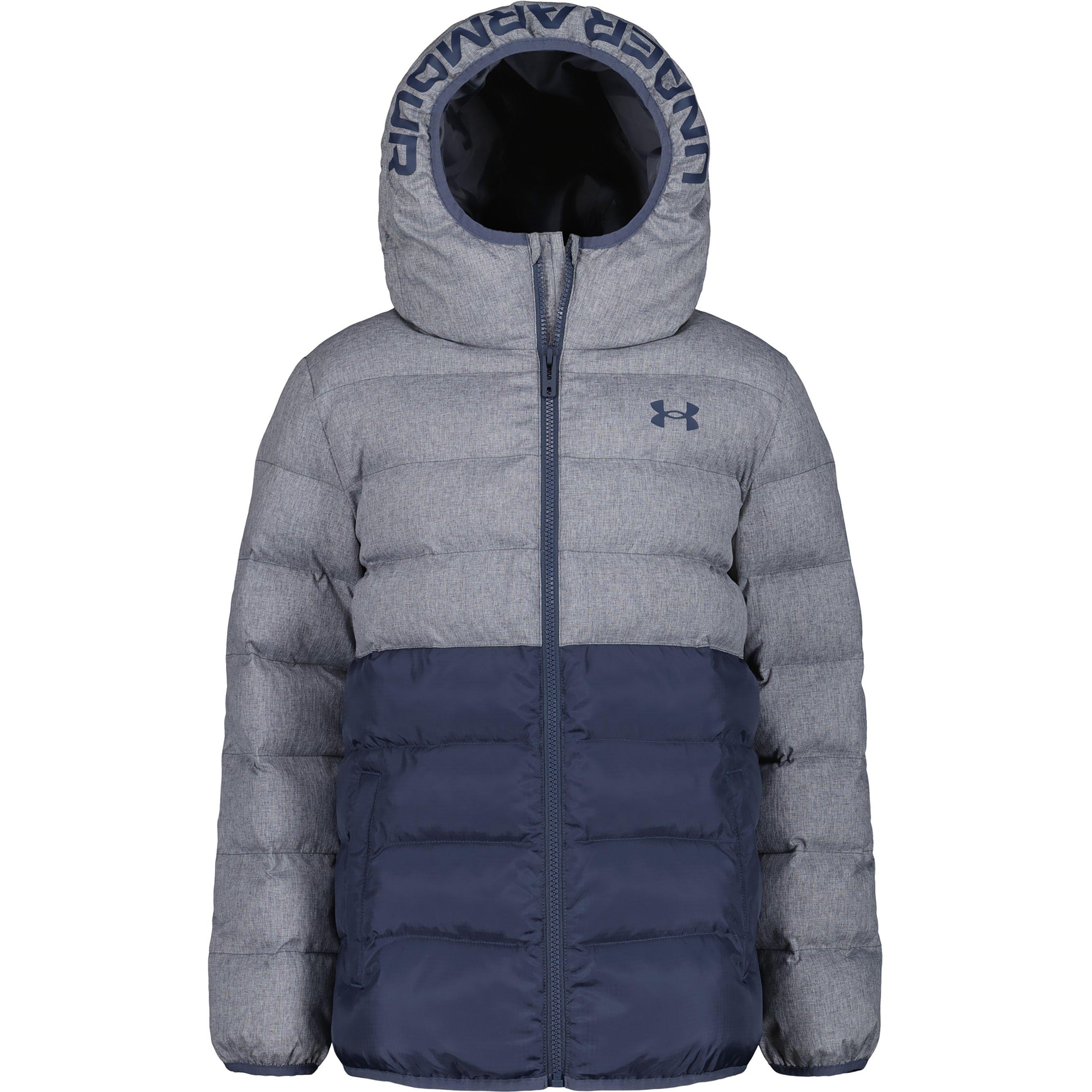 Halten Sie Ihre Kinder gemütlich in dieser Under Armour Pronto Kapuzen-Langarm-Pufferjacke. Entworfen mit dem Fokus auf Wärme, verfügt diese Oberbekleidung über eine Einfassung an der Kapuze, den Bündchen und dem unteren Rand für einen sicheren Sitz, während das UA-Logo sportliche Attraktivität verleiht.
